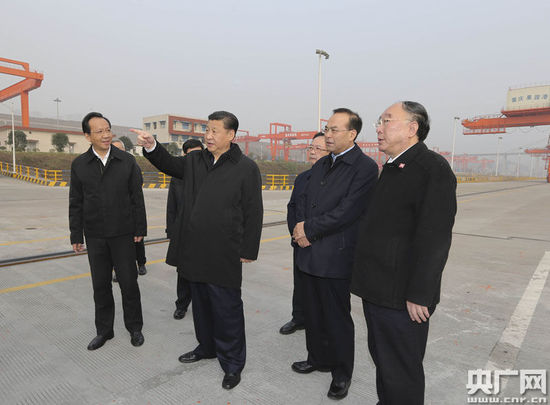 央廣網(wǎng)重慶1月5日消息 習(xí)近平總書記4日下午來(lái)到重慶果園港考察,聽取長(zhǎng)江上游航運(yùn)中心建設(shè)、鐵路公路水路聯(lián)運(yùn)等情況介紹,察看正在作業(yè)的集裝箱船。聽說(shuō)渝新歐國(guó)際鐵路沿線國(guó)家實(shí)現(xiàn)一次報(bào)關(guān)查驗(yàn)、全線放行,他贊賞“挺好”。看到港口設(shè)施齊備,已初具規(guī)模,他說(shuō):“這里大有希望。”