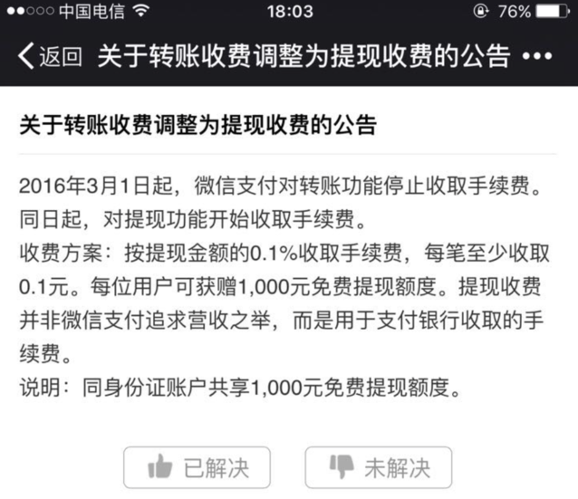 對(duì)于本次調(diào)整,微信方面表示,基于微信支付的每一筆轉(zhuǎn)賬和提現(xiàn)交易,事實(shí)上不論金額大小,銀行都要向微信支付收取交易手續(xù)費(fèi)。所以對(duì)提現(xiàn)交易收費(fèi)并不是微信支付追求營(yíng)收之舉,而是用于支付銀行手續(xù)費(fèi)。